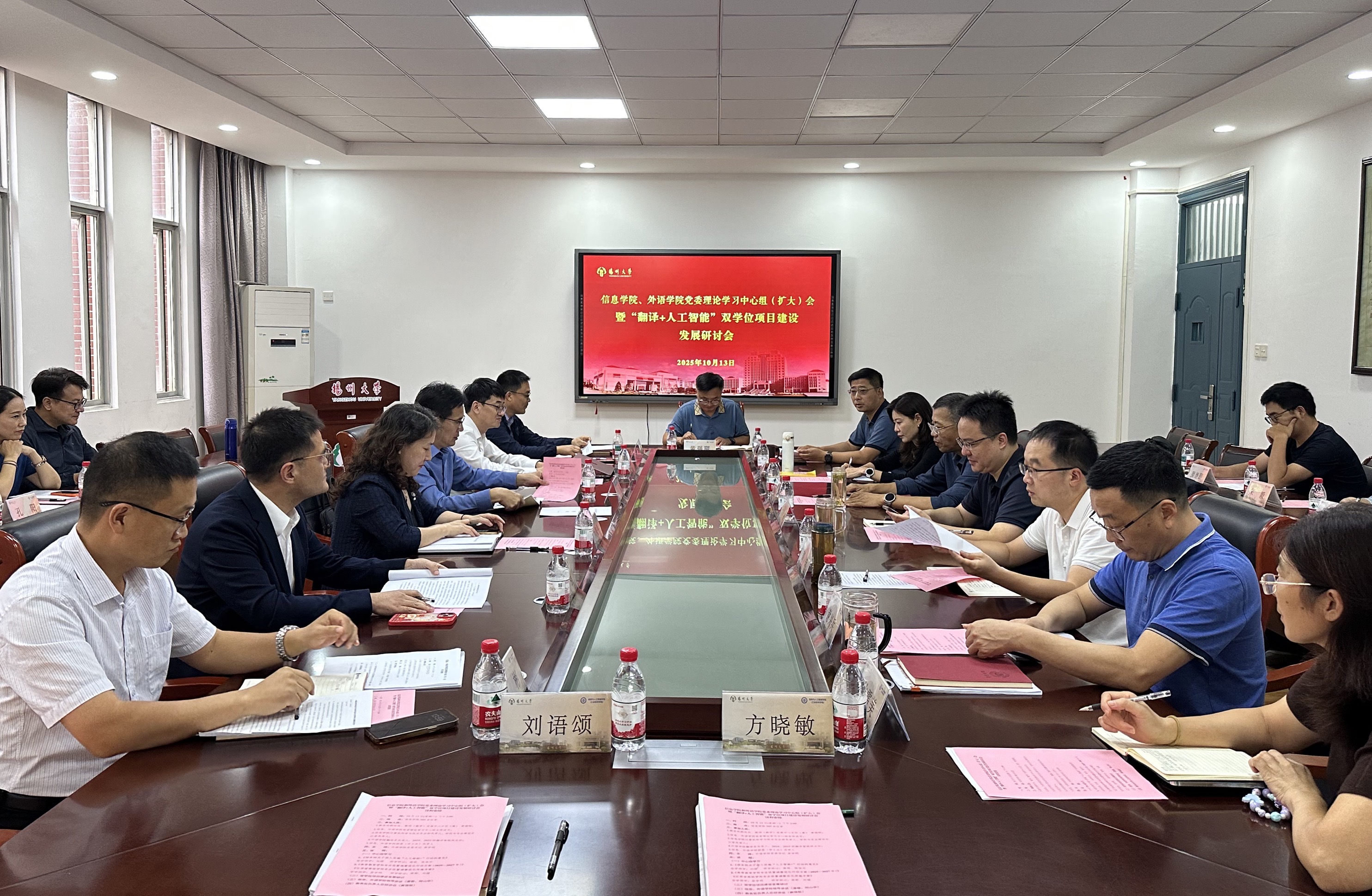 10月13日下午,我院与外语学院召开党委理论学习中心组(扩大)会暨“翻译+人工智能”双学位项目建设发展研讨会,教务处副处长、教师(教学)发展中心主任(兼)黄强联,外语、信息学院党委理论学习中心组全体成员,相关专业、团委(学工办)负责人等参加会议,会议由外语学院党委书记居学明主持。