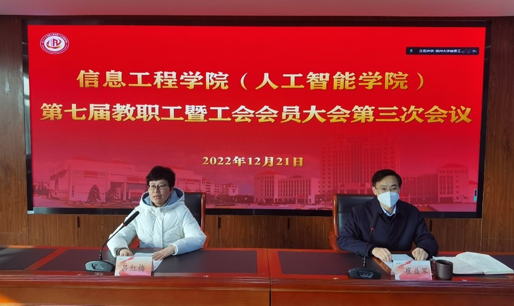 12月21日下午,学院隆重召开了第七届教职工暨工会会员大会第三次会议。院党委书记吕红梅出席会议并发表讲话。大会听取并审议了院长孙小兵所作的《踔厉奋发 笃行不怠 聚力推进高水平研究型学院建设再迈新台阶》工作报告,审议通过了院工会主席潘钧所作的工会工作报告。院党委副书记崔益军主持会议。