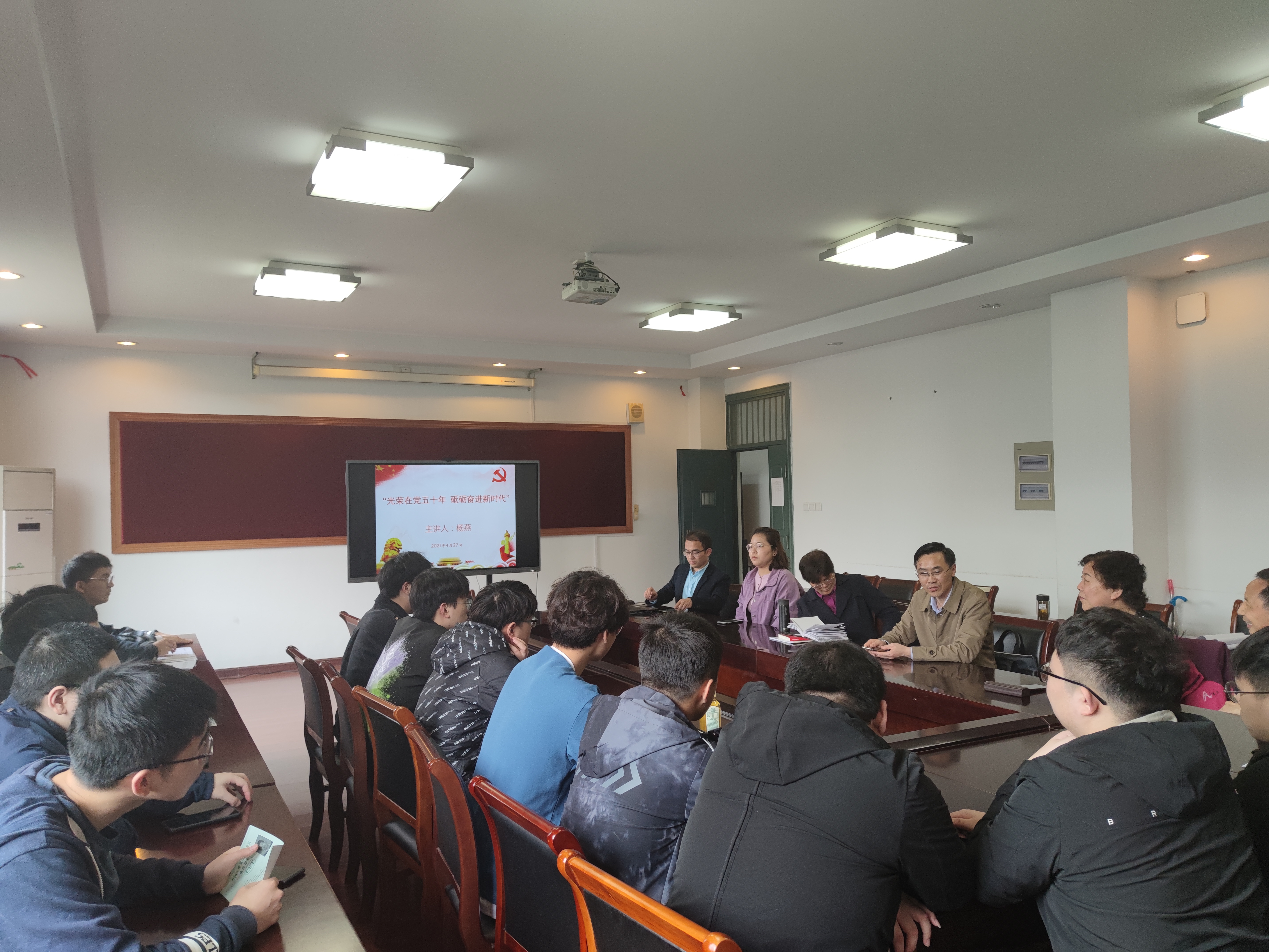 4月27日下午,扬大路北党总支第二党支部洪佛老师、杨燕老师、陈启银老师与我院共建班计科1701班开展了党史教育活动。院党委副书记崔益军、团委书记张海兵、班主任王浩月以及计科1701班全体同学参加。