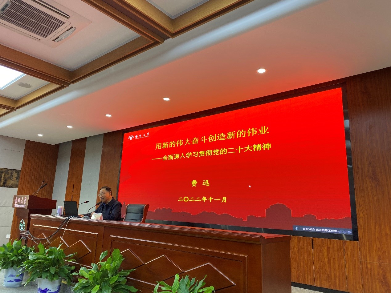 费老师围绕新时代十年的伟大变革及其里程碑意义、开辟马克思主义中国化时代化新境界、以中国式现代化全面推进中华民族伟大复兴的使命任务、对未来五年党和国家各项事业发展的战略部署、以党的伟大自我革命引领伟大社会革命的重要要求、为全面推进中华民族伟大复兴而团结奋斗、党对新时代新征程上中国新青年的殷切期望等七个方面展开分享。