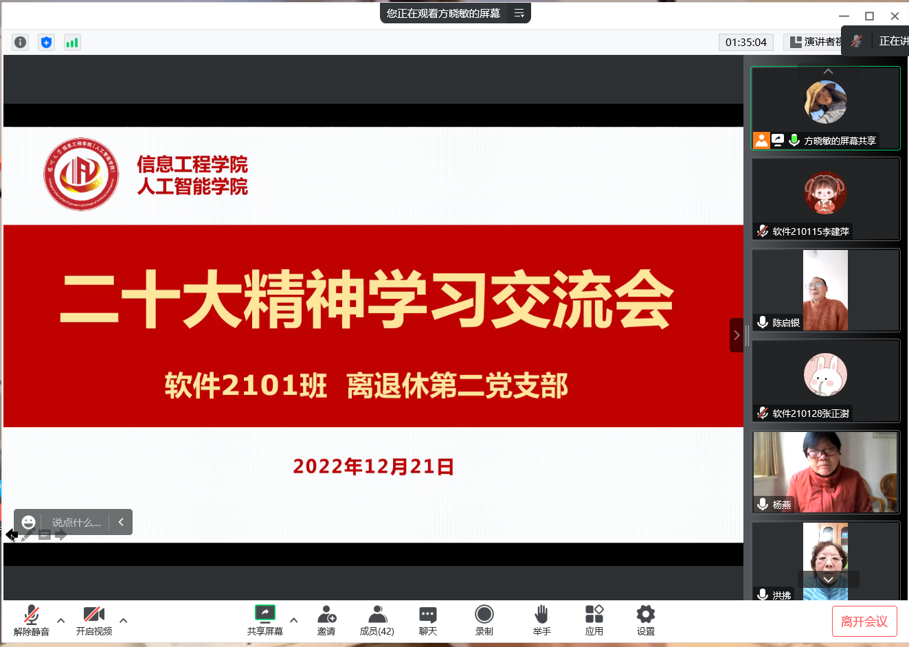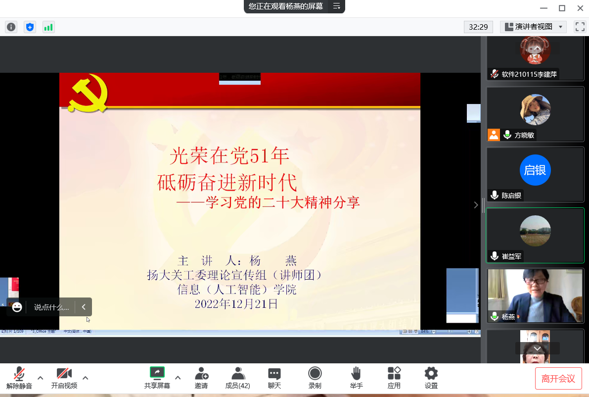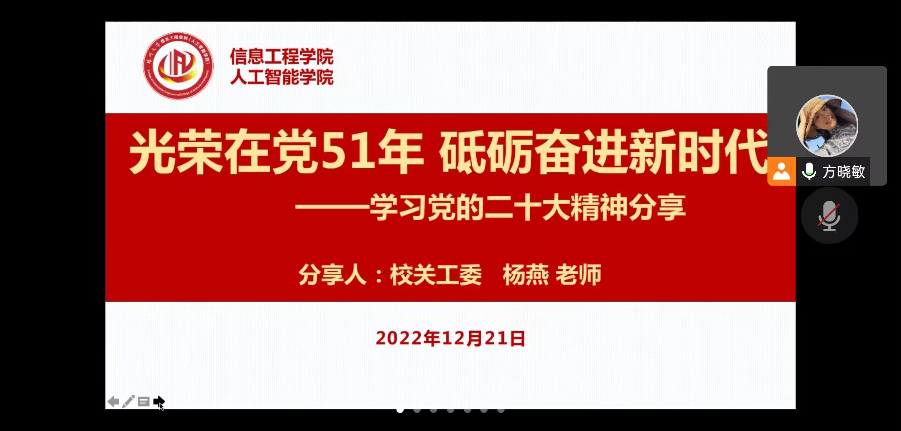 12月21日,学院组织开展“光荣在党51年 砥砺奋进新时代”--学习党的二十大精神分享主题活动。活动邀请校关工委讲师团杨燕老师主讲,江阳路北校区离退休第二党支部洪拂老师、陈启银老师参加分享。学院团委副书记、关工委执行秘书方晓敏老师主持活动,2022级部分新生参加活动。