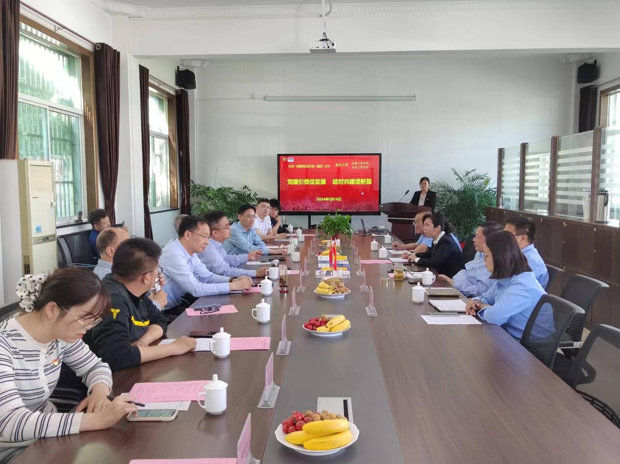 为充分发挥党建引领作用,加强“党团班”一体化建设,双方首先举办校企支部共建工作会议。王修山董事长对学院的到访表示欢迎,并详细介绍了企业的发展历程、业务范围、技术创新以及未来的战略规划等方面内容。张超院长介绍了扬州大学的办学历史以及机械工程学院的学院概况,崔益军副书记就信息工程学院概况以及江苏省研究生工作站的建设规范进行了阐述,并描绘了双方未来工作站建设的美好前景。学院共建研究生党支部书记就支部概况进行发言,并表示本次共建有助于开阔学生眼界,增长见识,明确学生未来的努力方向和职业规划。随后,三方进行了支部共建签约仪式。
