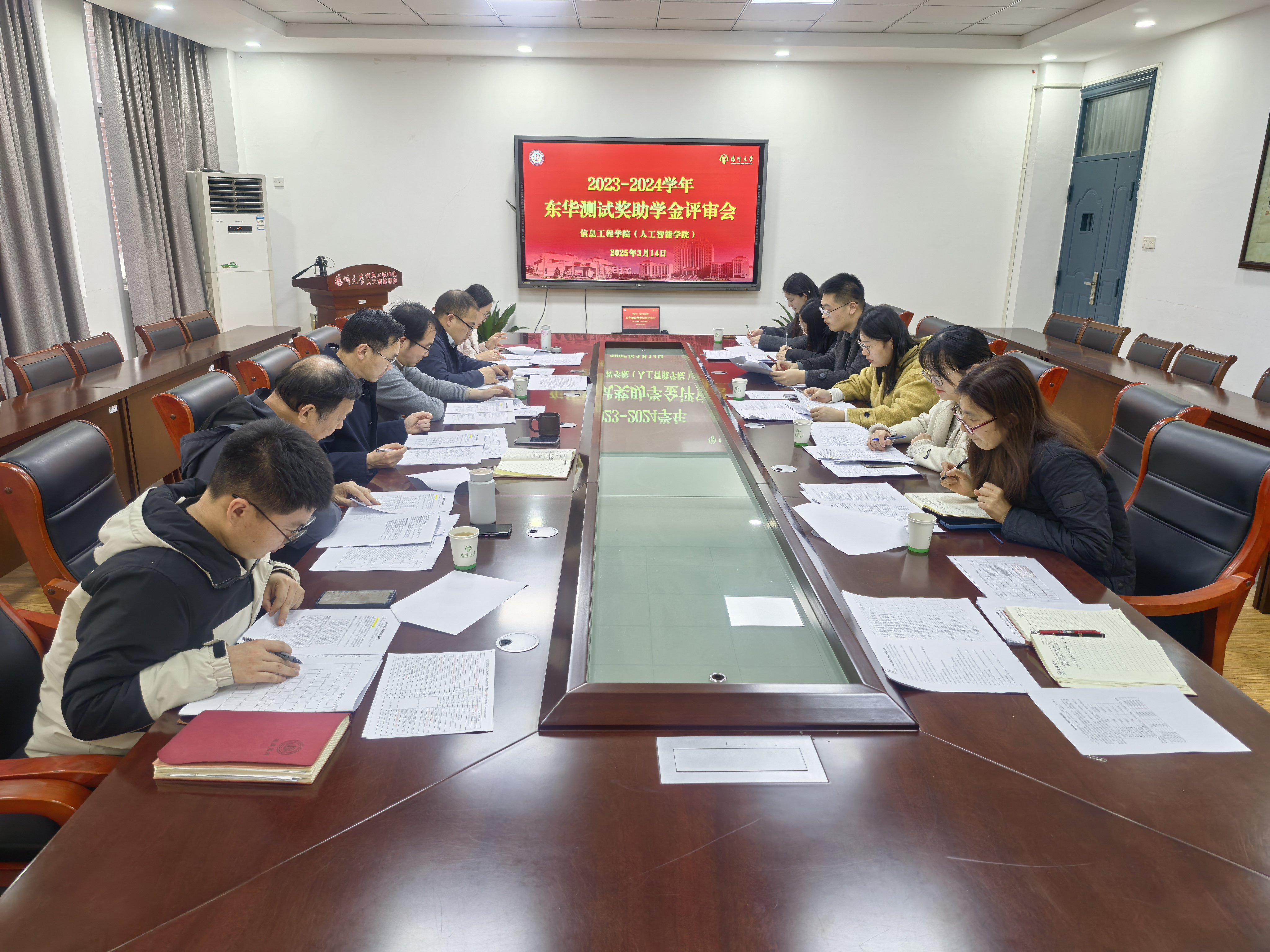 会上,本科生评奖评优辅导员黄敏、研究生辅导员高兴围绕《扬州大学东华测试奖助学基金评比办法》实施细则,就评审标准、名额分配及推荐程序等政策要求进行了详细解读,并系统汇报了前期院系初审工作开展情况。经评审委员会严格审议,全体评委秉持公平、公正、公开、择优的评审原则,通过资格审查、材料核验、会议评议等规范程序,最终遴选出34名品学兼优的拟推荐人选,圆满完成本年度奖助学金评审工作。