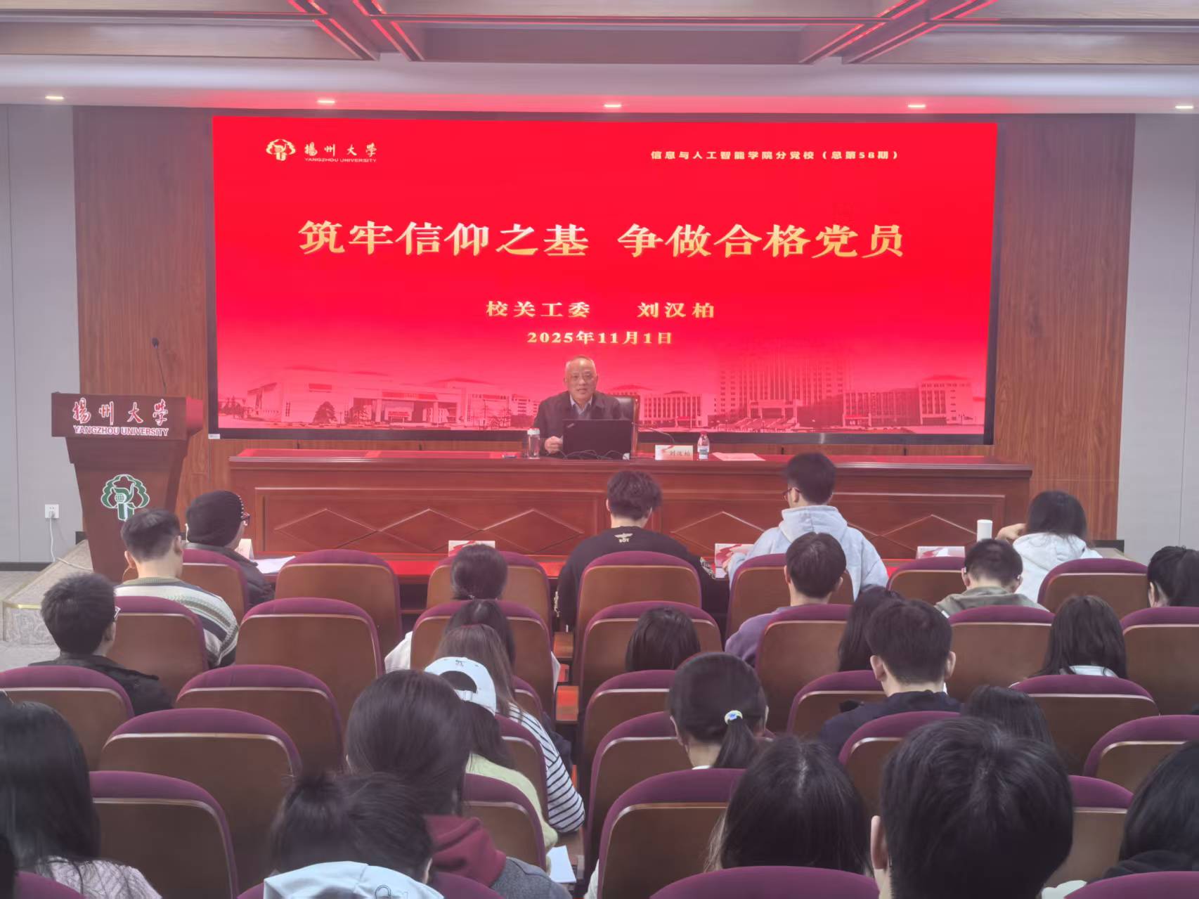 11月1日,信息与人工智能学院(工业软件学院)在三楼报告厅举办预备党员培训班。本次培训班特邀校关工委办公室主任、秘书长刘汉柏老师主讲。