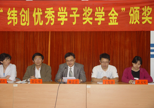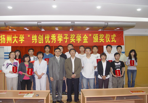 2010年6月9日上午11点,扬州大学“纬创优秀学子奖学金”颁奖仪式在信息学院5-211报告举行。纬创资通(昆山)有限公司赖志忠厂长、丁先锋课长、校学生处张信华副处长、信息学院党委杨延红副书记等出席了奖学金颁奖仪式。