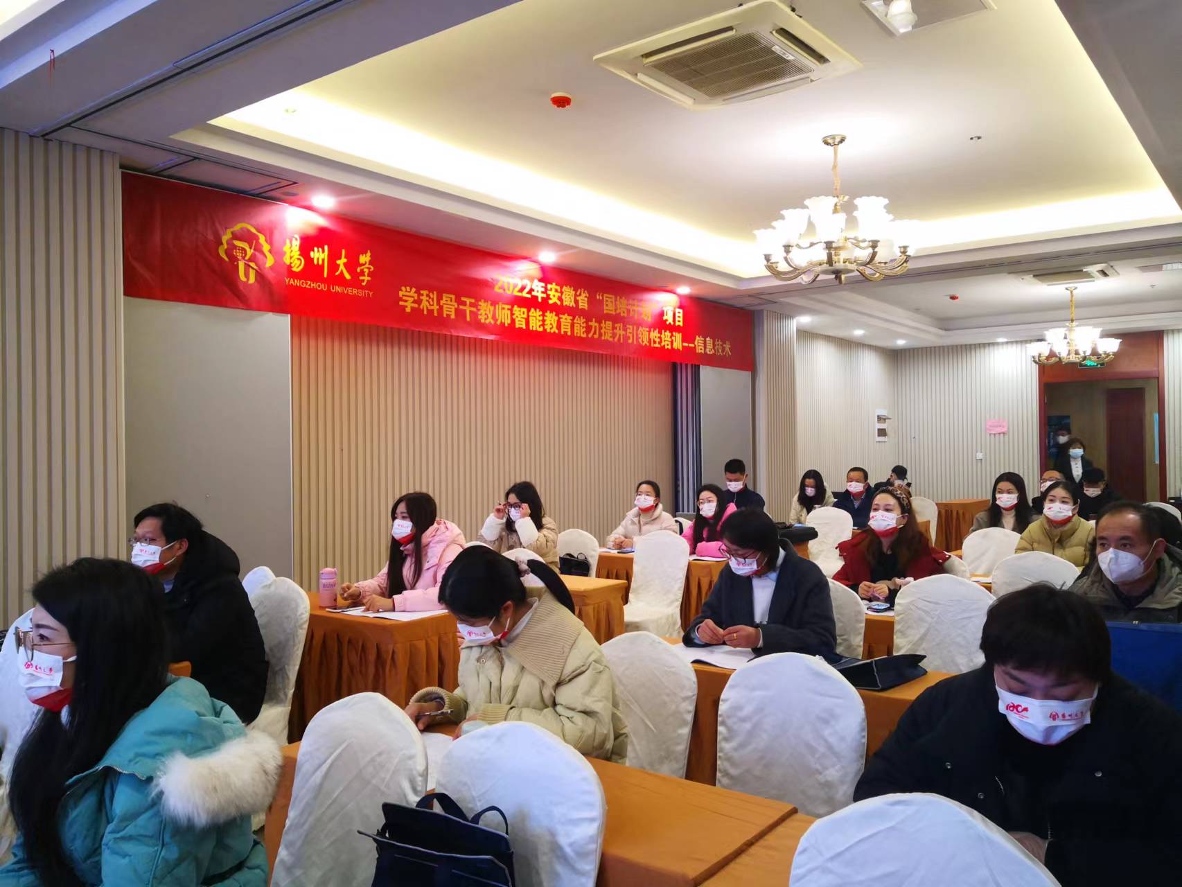 由安徽省教育厅国培办组织、扬州大学信息工程学院(人工智能学院)承办的“学科骨干教师智能教育能力提升引领性培训——信息技术”培训项目于 2023 年 1 月 5号在扬州顺利开班 ,扬州大学继续教育学院副院长洪秀兵,信息工程学院(人工智能学院)党委书记吕红梅、副院长闵海强参加了开班仪式。会议由闵海强副院长主持,洪秀兵副院长代表扬州大学致辞,并向学员简要介绍了扬州大学的情况,吕红梅书记代表学院介绍了学院的学科建设等情况,来自安徽省的120名学员参加了本次的开班仪式。
