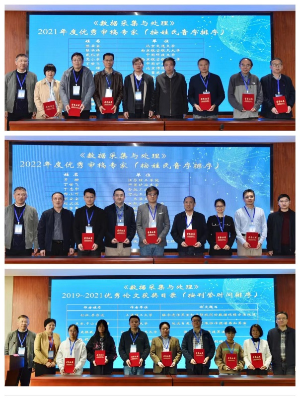《数据采集与处理》副主编赵耀教授与杨绿溪教授、扬州市科协钱靖平副主席、南航科协秘书长冯绍红教授、我院院长孙小兵教授与副院长裔扬教授分别为《数据采集与处理》2021年和2022年优秀审稿人,2019~2021年优秀论文作者颁发奖状。