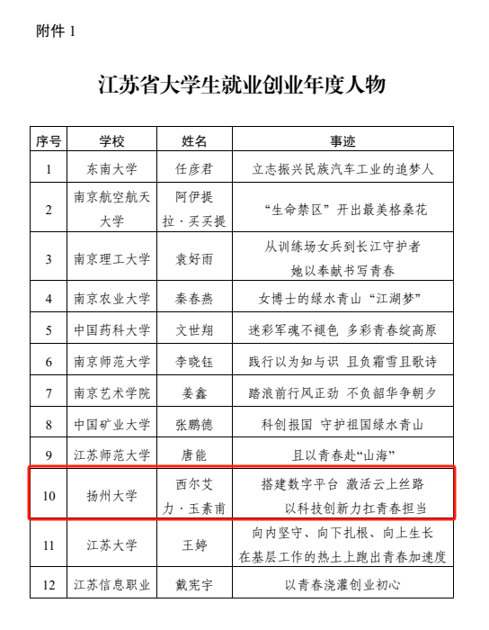 近日,江苏省高校招生就业指导服务中心公布大学生就业创业年度人物评选结果,我院卓越2201、电子2203班学生西尔艾力·玉素甫获评省“大学生就业创业年度人物”。