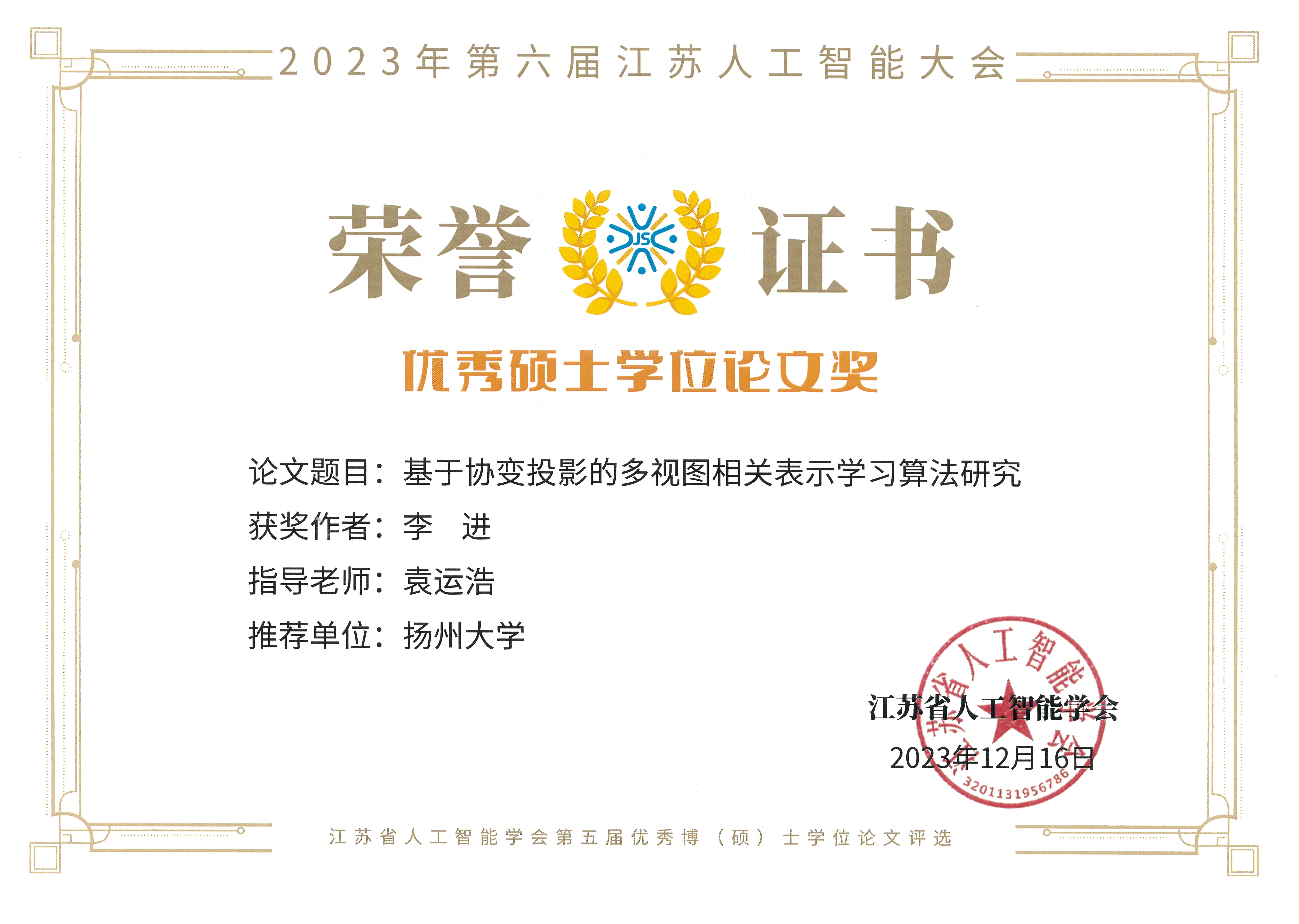 12月16日,从江苏省人工智能学会(JSAI)传来喜讯,我院袁运浩老师指导的李进研究生的论文《基于协变投影的多视图相关表示学习算法研究》获第五届优秀硕士学位论文奖。
