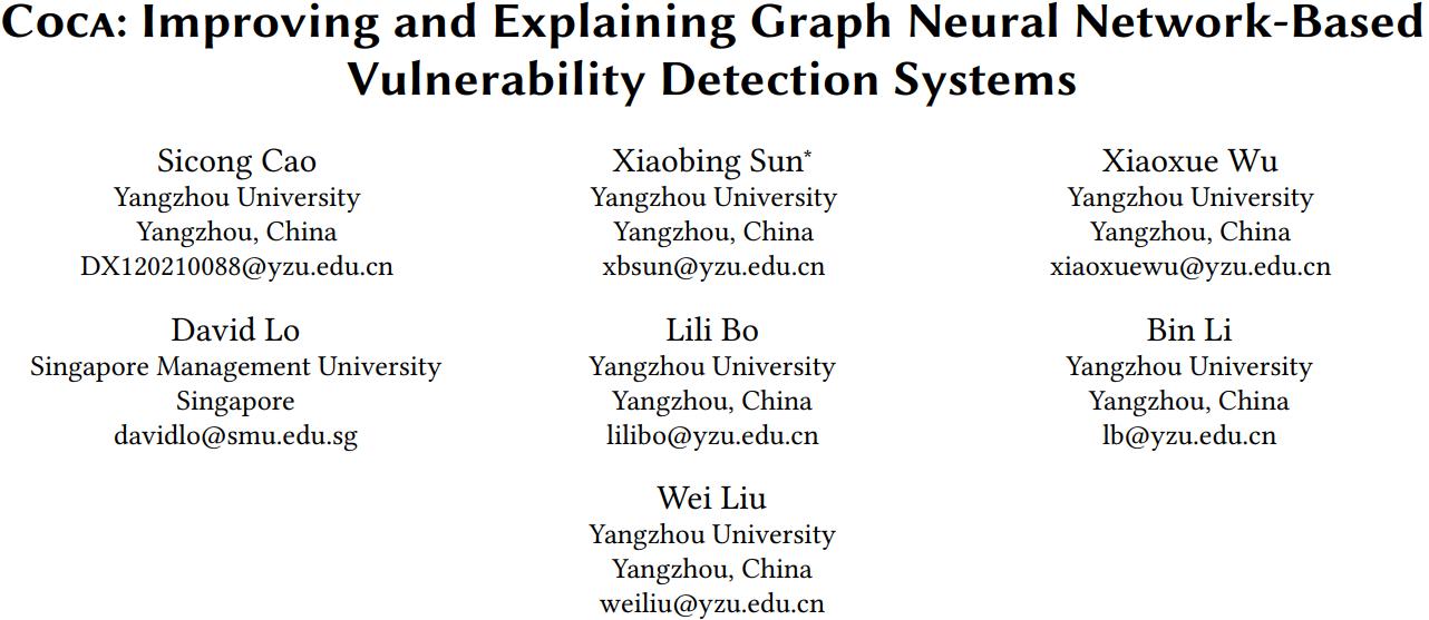 在刚公布的国际软件工程顶级会议ICSE 2024 (International Conference on Software Engineering)论文录用结果中,我院博士生曹思聪为第一作者的论文“Coca: Improving and Explaining Graph Neural Network-Based Vulnerability Detection Systems”以长文类型录用。