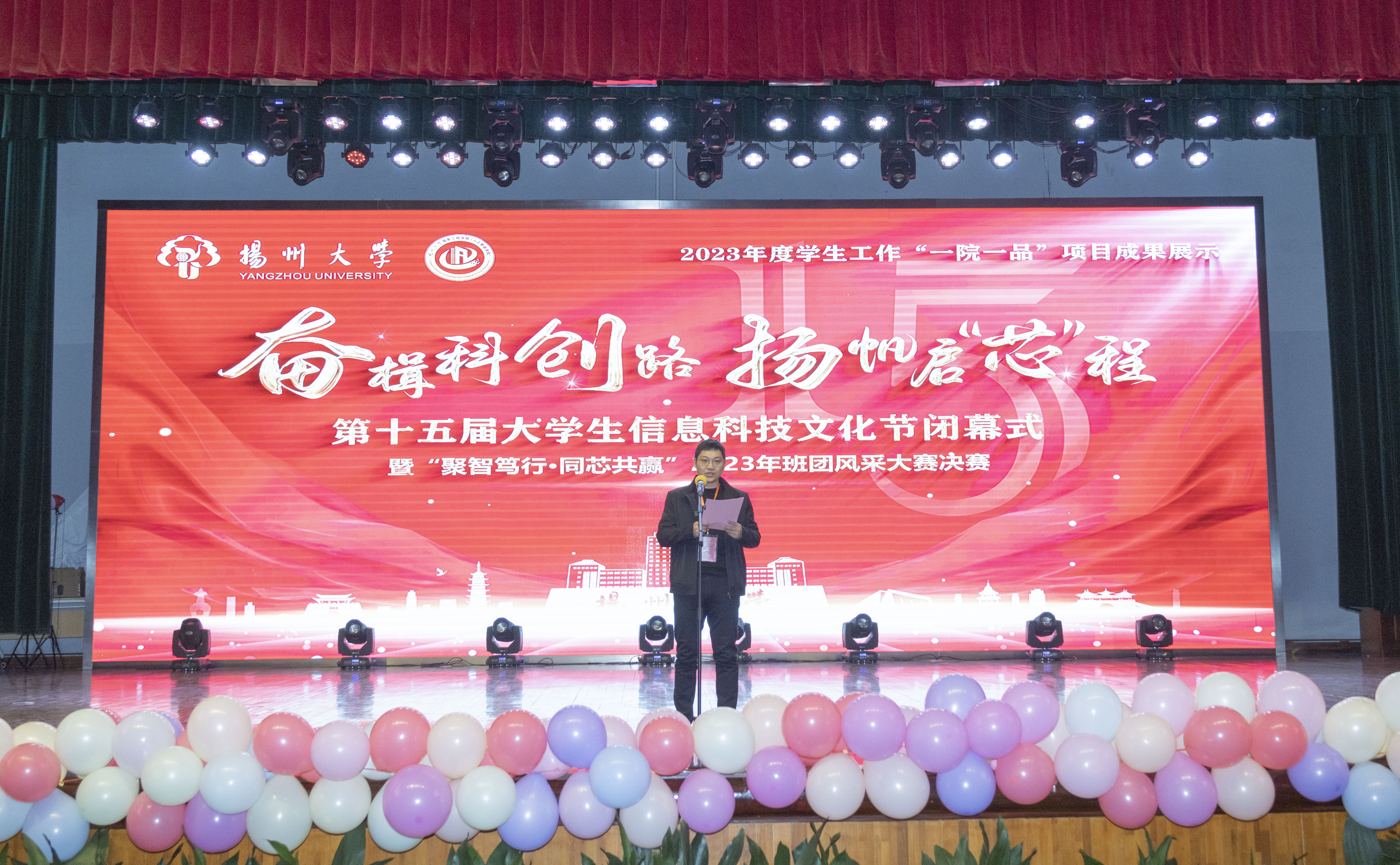 12月27日晚,学院“奋楫科创路,扬帆启‘芯’程”第十五届大学生信息科技文化节闭幕式暨“聚智笃行,同‘芯’共赢”2023年班团风采大赛决赛在扬子津校区文体馆三楼小剧场隆重举行。教务处处长严长杰,校对外联络办公室(校友会、董事会、教育基金会办公室)主任陈克勤,党委宣传部副部长刘斯文,党委研究生工作部副部长居再宏,党委学生工作部(处)副部(处)长张平,党委保卫部(处)副部(处)长周佳正,军工科研生产管理办公室主任郭志波,校团委副书记王敏,江阳路北校区离退休第二党支部书记李宜祥,校关工委办公室主任刘汉柏,安普科技有限公司董事长韩春阳,江苏科瑞恩科技股份有限公司人力资源中心总监孟祥波,百纳德(扬州)电能系统股份有限公司营销总监包晓飞,朗坤智慧科技股份有限公司人力资源副总监杨浩等出席活动。