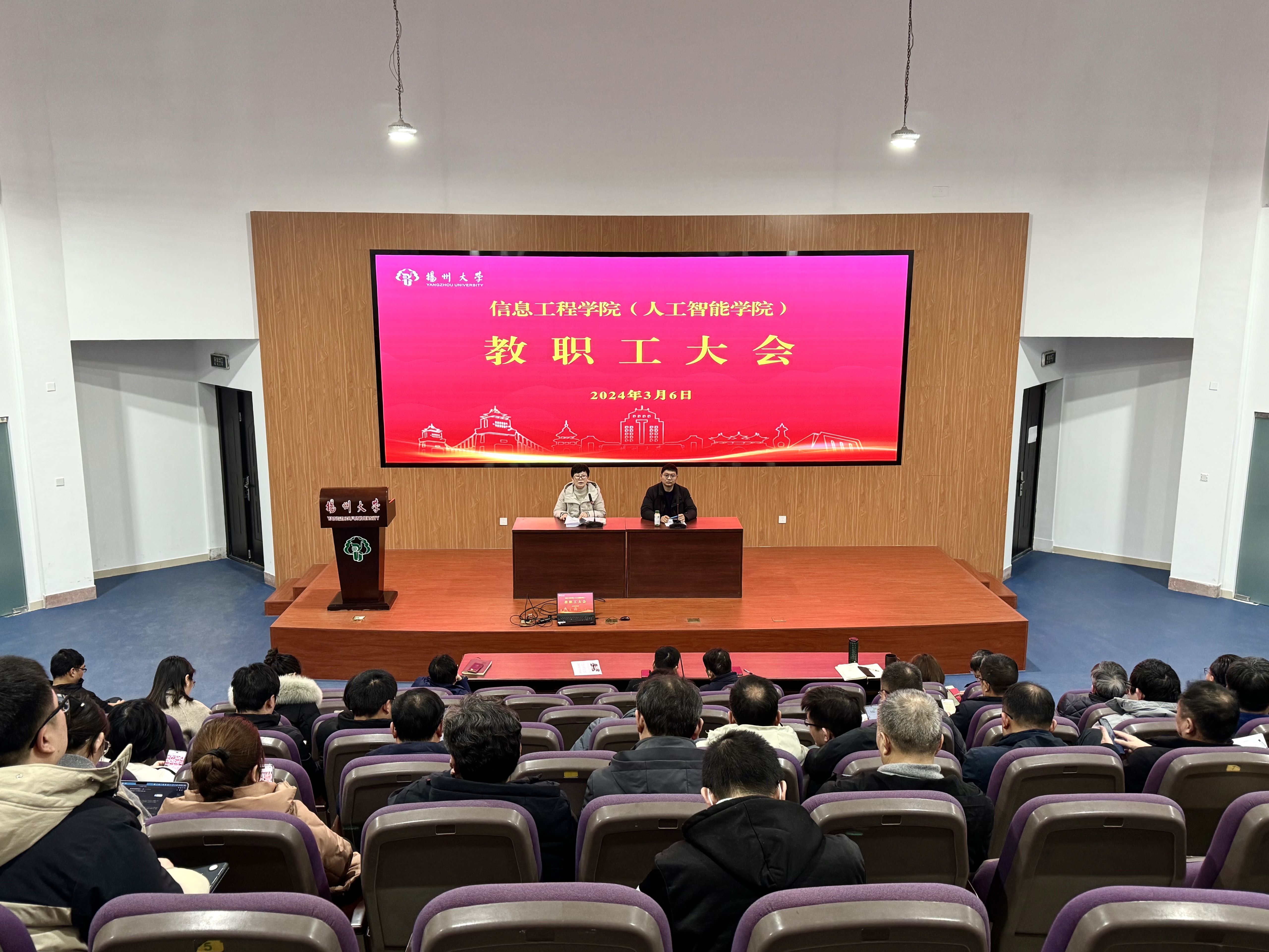 3月6日下午,学院在东报告厅召开新学期全院教职工大会。院党委书记吕红梅出席会议并讲话,院长孙小兵主持会议并作工作报告,全体院领导、教职工参加会议。