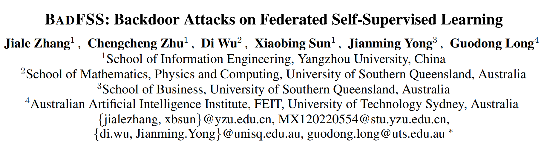 在刚公布的国际人工智能顶级会议IJCAI 2024 (International Joint Conference on Artificial Intelligence)论文录用结果中,我院教师张佳乐副教授与硕士生朱诚诚等人的论文“BADFSS: Backdoor Attacks on Federated Self-Supervised Learning”被录用。