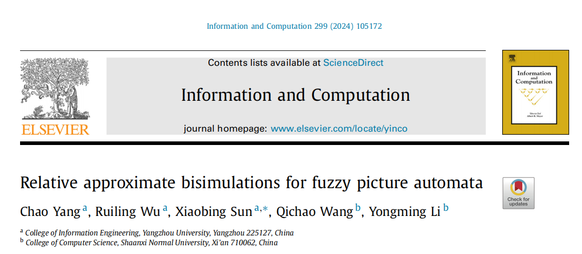 近日,我院软件与安全团队教师杨超与学生吴蕊伶在计算机科学理论领域顶级期刊《Information and Computation》发表了题为“Relative approximate bisimulations for fuzzy picture automata”的研究论文(https://www.sciencedirect.com/science/article/abs/pii/S0890540124000373)。