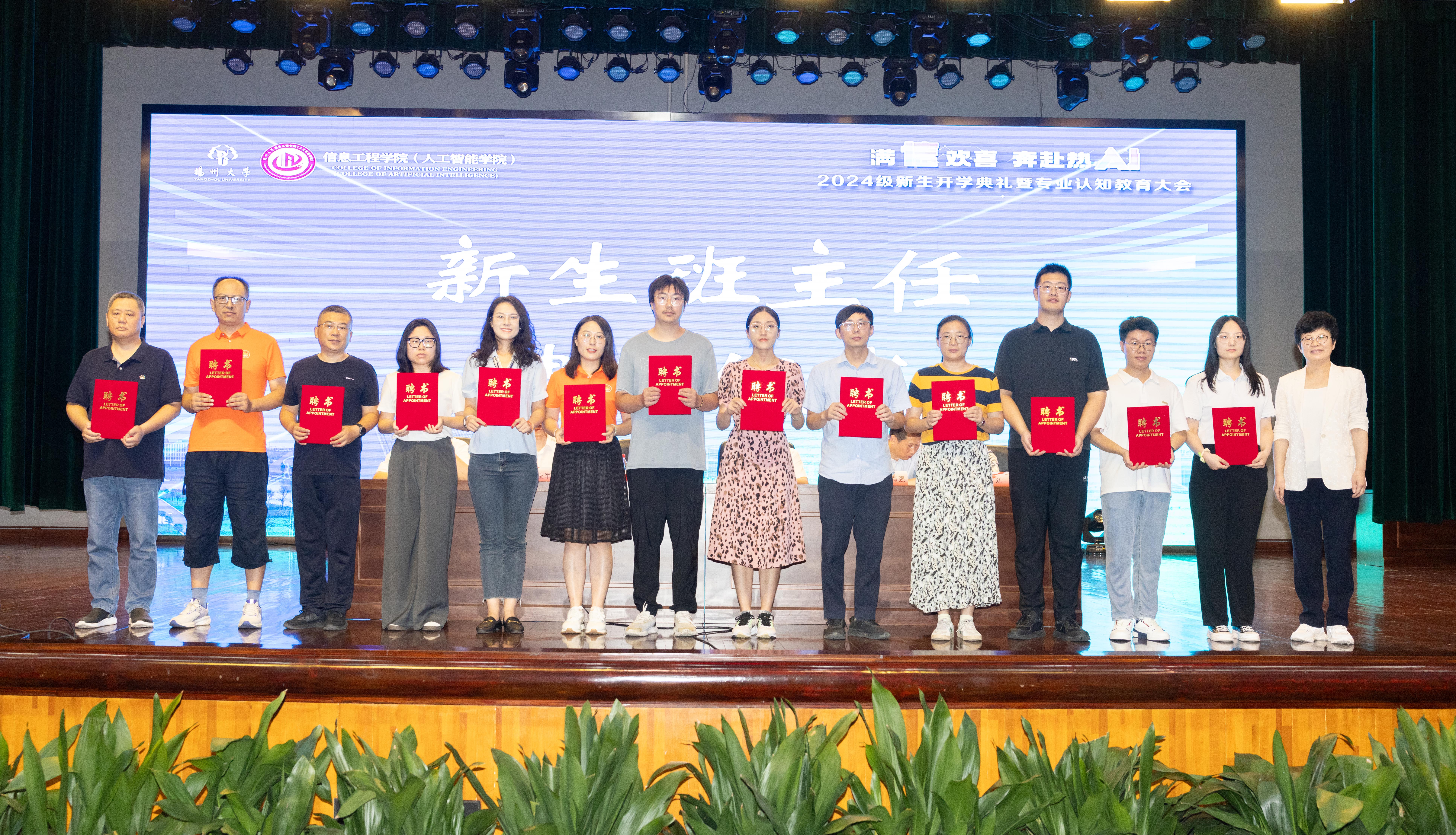 院党委书记吕红梅为新生班主任颁发聘书,院党委副书记崔益军为新生班主任助理颁发聘书;计算机科学与技术专业部副主任张佳乐副教授作为教师代表发言,他激励新生们保持对未来的好奇与探索,平衡生活,合作共赢,敢于实践,脚踏实地,追逐梦想,描绘未来蓝图,收获无悔青春;院学生会执行主席谢宇宸同学作为老生代表发言,他分享了在专业学习和学生工作中的经验与感悟,鼓励学弟学妹尽快适应新的节奏,在一次次失败中吸取宝贵经验,愈挫愈勇,在合作互助中探索创新的魅力,在挑战与机遇中挥洒青春汗水;“凡是过去,皆为序章。”智能2401班周宇婕同学作为新生代表上台发言,她启发全体新生同龄人要以拓展边界挑战极限的勇气,不畏艰难永不言弃的刚毅,不卑不亢自信从容的心态,去迎接远航路上的无限可能。