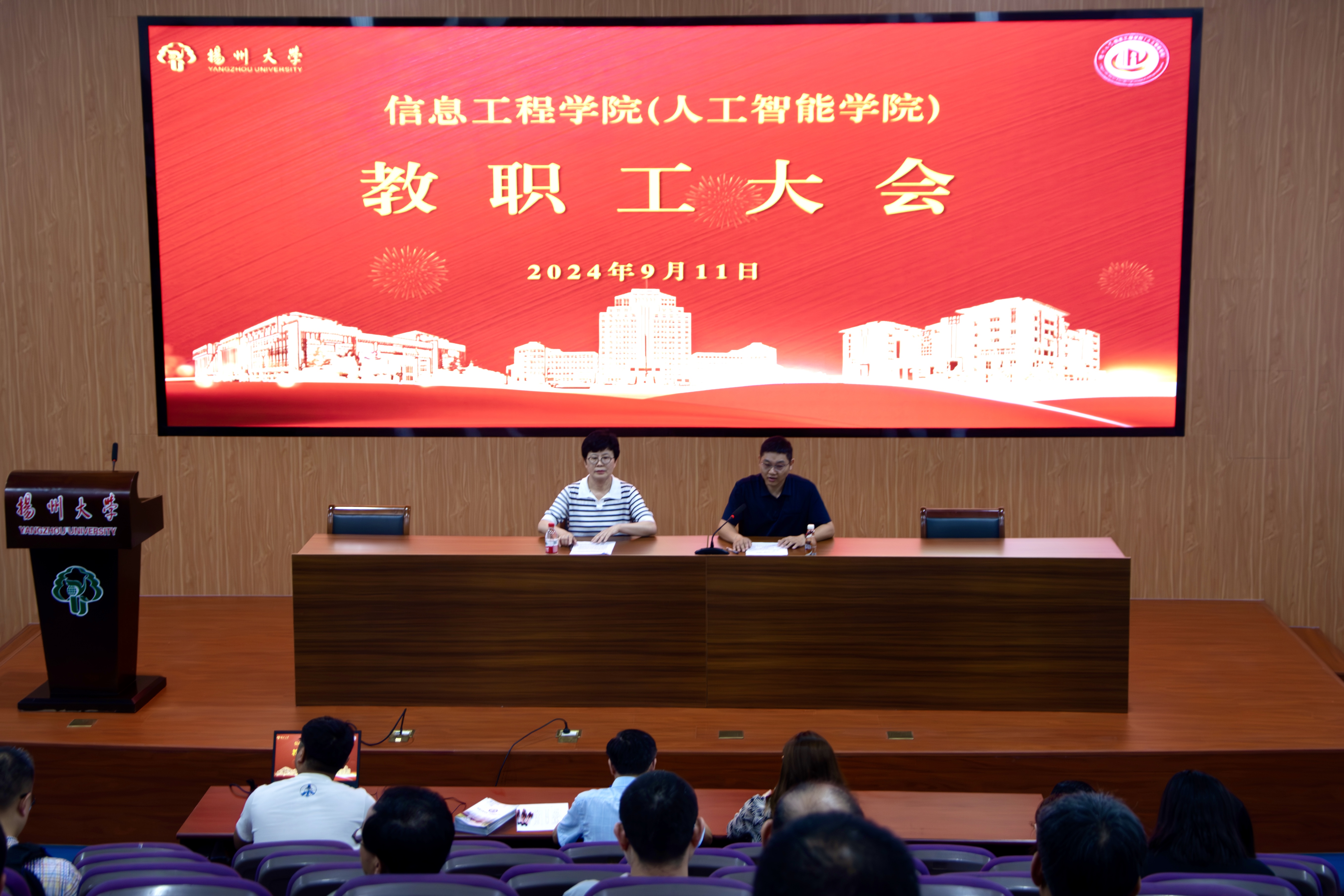 2024年9月11日下午,学院在东报告厅召开新学期全体教职工大会。院党委书记吕红梅、院长孙小兵、院党委副书记崔益军、副院长闵海强、副院长裔扬、副院长刘维出席大会,全体教职工参加会议。