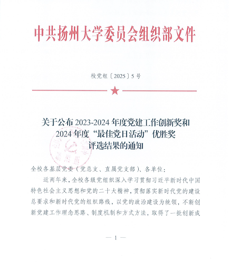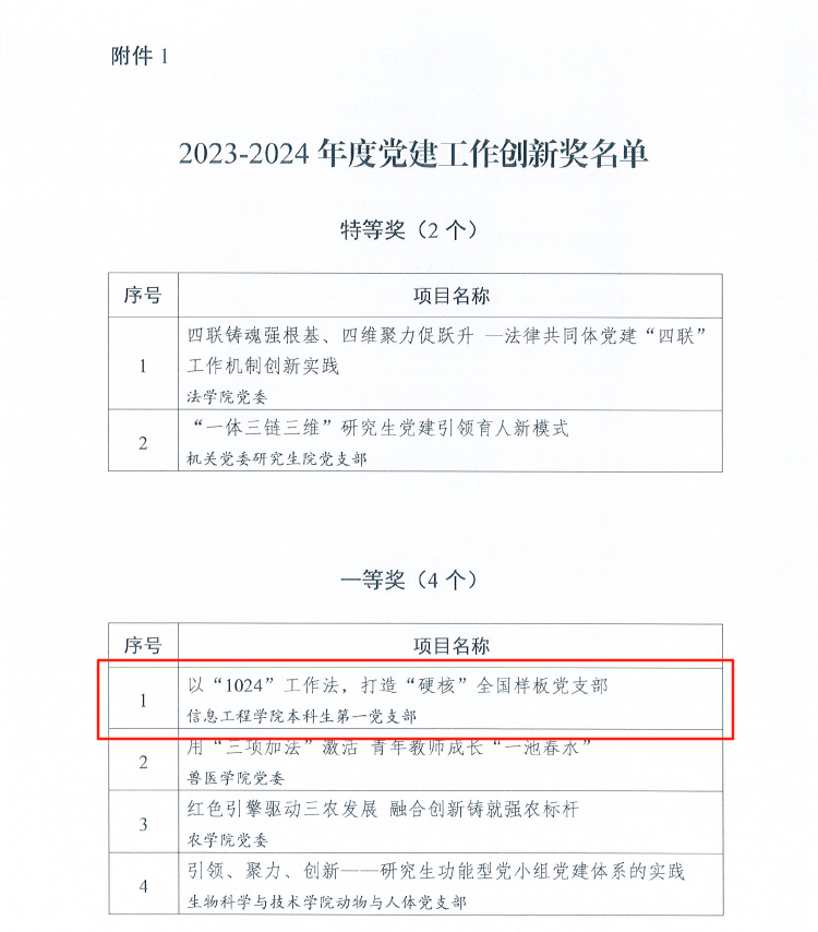 近日,学校2023—2024年度党建工作创新奖名单公布,我院本科生第一党支部申报的“以‘1024’工作法,打造‘硬核’全国样板党支部”项目获一等奖。