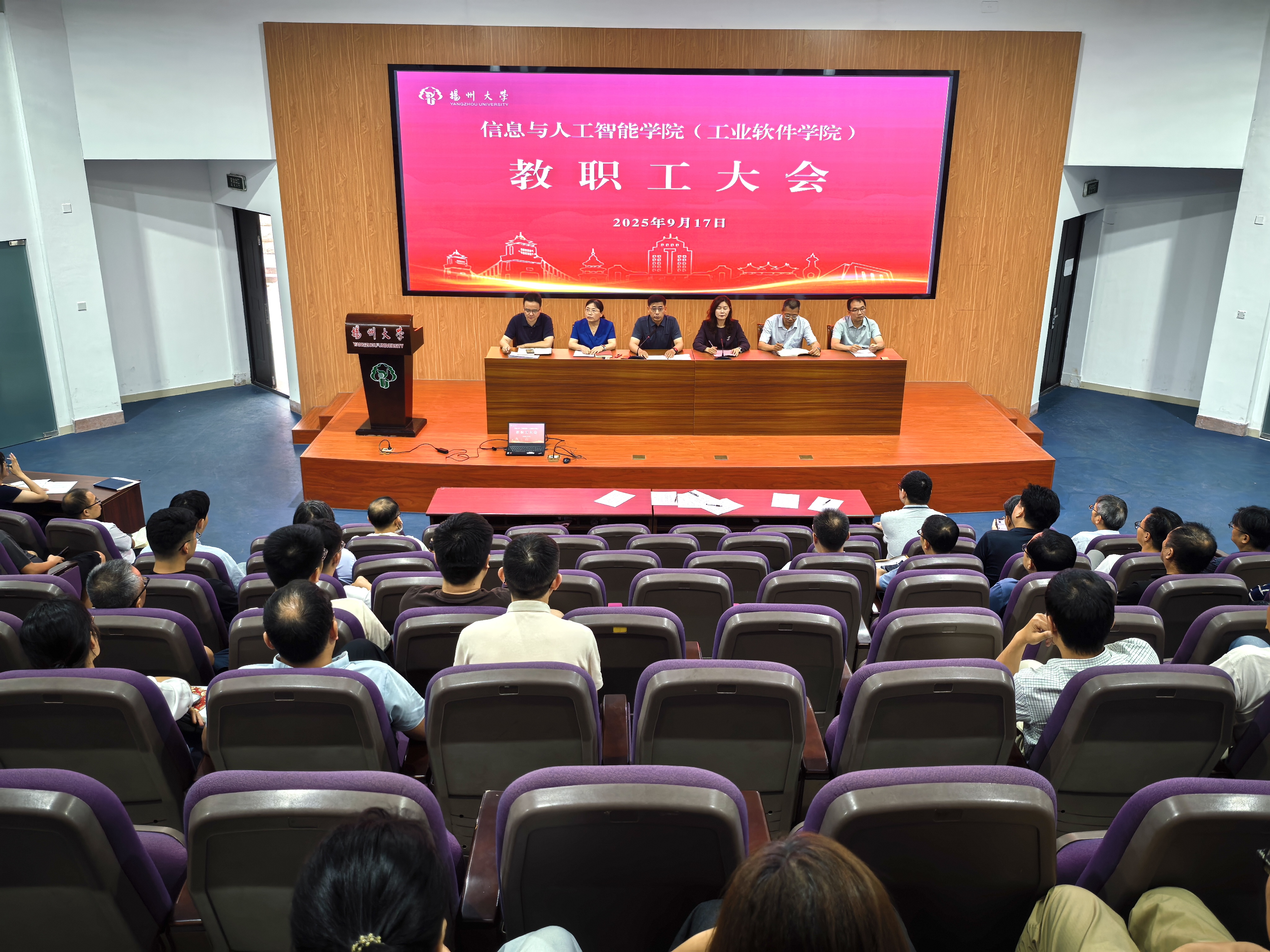 9月17日下午,学院在东报告厅召开新学期全体教职工大会。院党委书记潘骏,院长刘维,院党委副书记左红梅,副院长郭志波,副院长裔扬,副院长高锐出席大会。院党委书记潘骏主持大会。