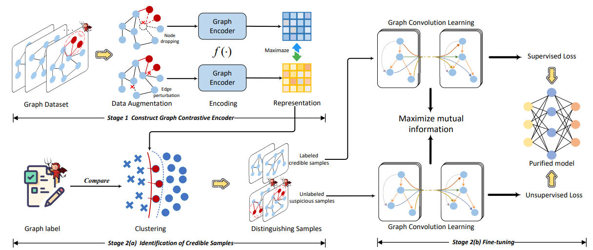 图神经网络(GNNs)凭借强大的图结构数据处理能力,已广泛应用于诈骗检测、漏洞分析、流量预测等多个领域。为追求更好性能,GNNs需大量训练数据,而现实中常用的第三方公开数据集易遭恶意篡改,引发后门攻击风险。现有GNN后门防御方法存在明显局限:基于可解释性和数据隔离的方案难以检测隐蔽触发器;差异学习方法在过滤后门特征时会丢失有用信息,导致模型性能下降。同时,计算机视觉领域的对比学习防御方案未考虑图数据特有的拓扑结构信息,迁移至图领域效果有限。为此,本研究设计了一种全新的图后门防御方法,采用图对比训练破除后门关联,同时引入互信息最大化以优化性能。实验结果表明,本方法在大规模数据集上能保持高效防御能力,且适配多种GNN架构,展现出良好的通用性和稳定性。