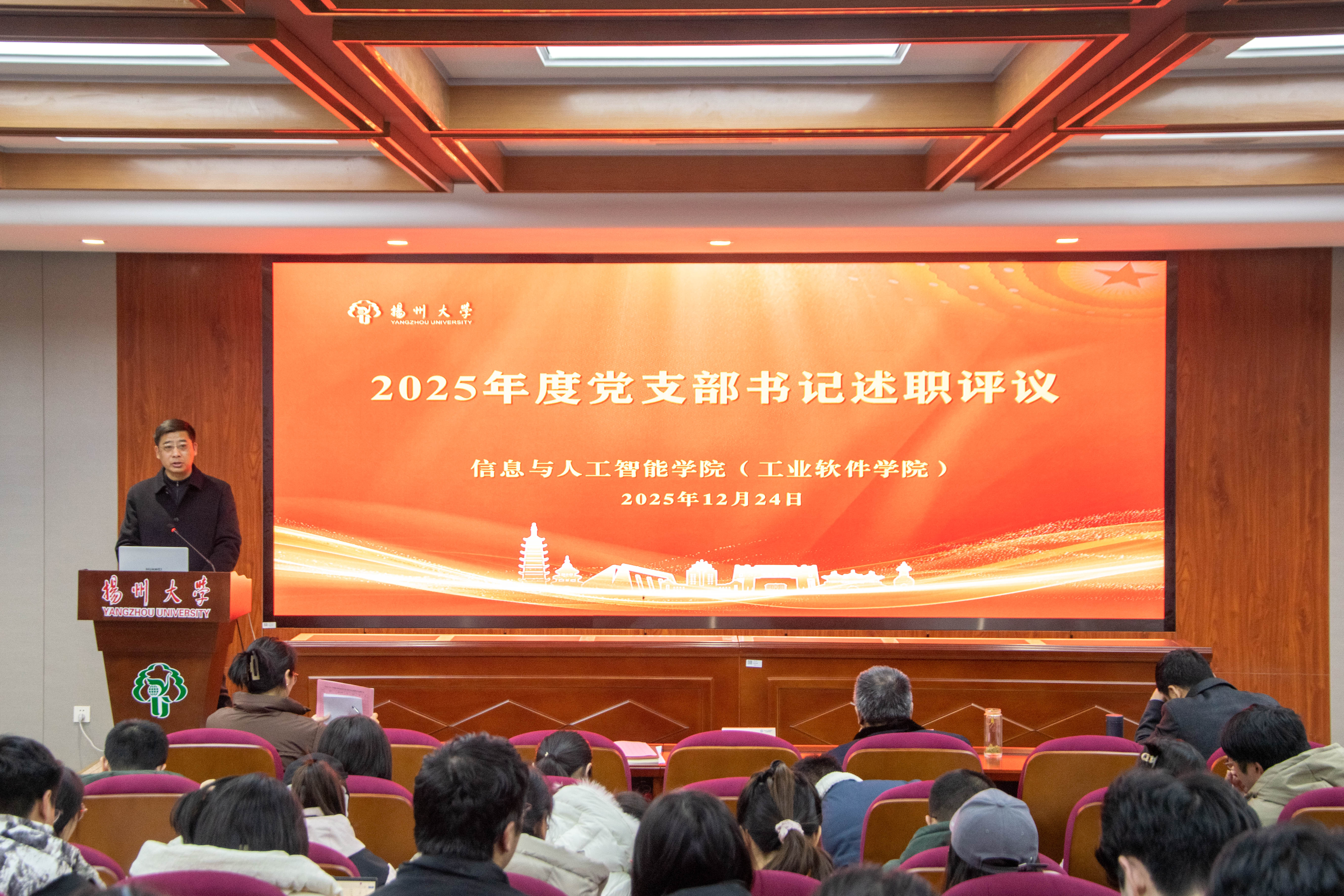 12月24日下午,学院在三楼报告厅举行2025年度党支部书记述职评议会。全体在扬院领导出席会议,学院全体党支部书记、支部委员、部分教师和学生党员代表参加了会议。